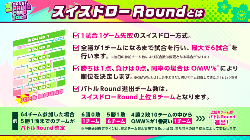 ・今大会は、スイスドローRoundとバトルRoundの2つに分かれており、スイスドローRoundの上位チームがバトルRoundに進むことができます。